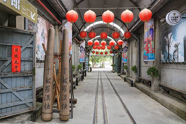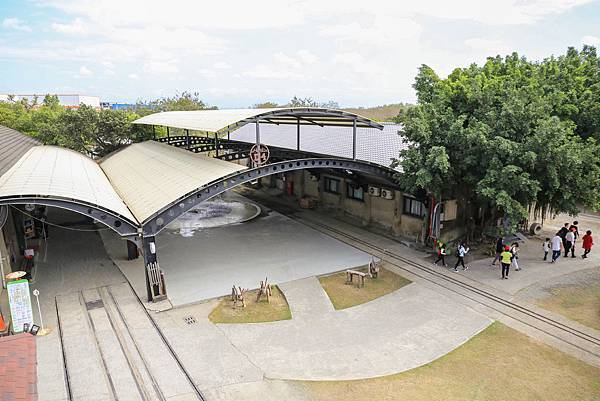 園區內還保留有糖廠小火車的軌道!前方棚內是鼓之眼水舞廣場。