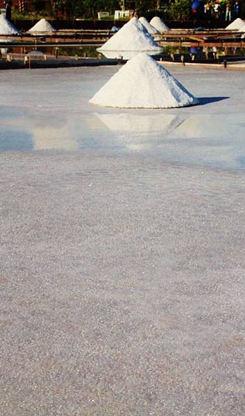 有些結晶池內水量較少,底層已有許多鹽經沉澱,陽光照射下潔白無瑕~