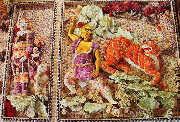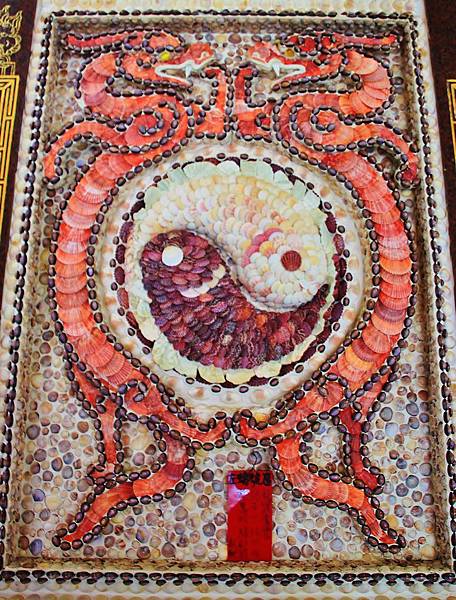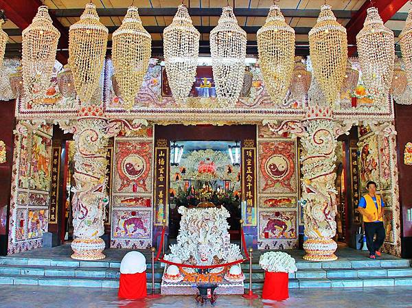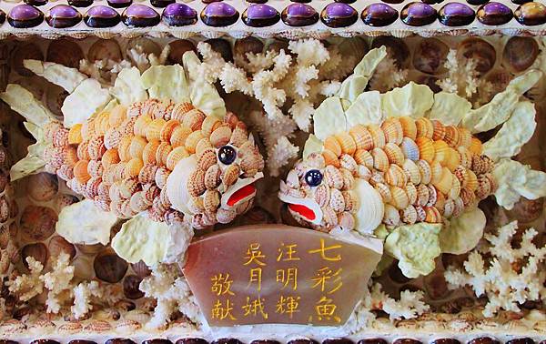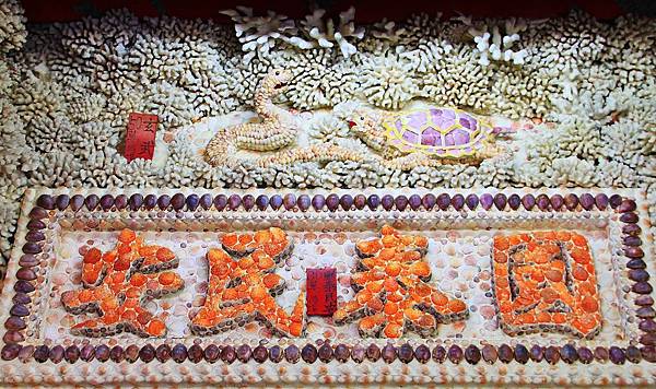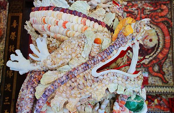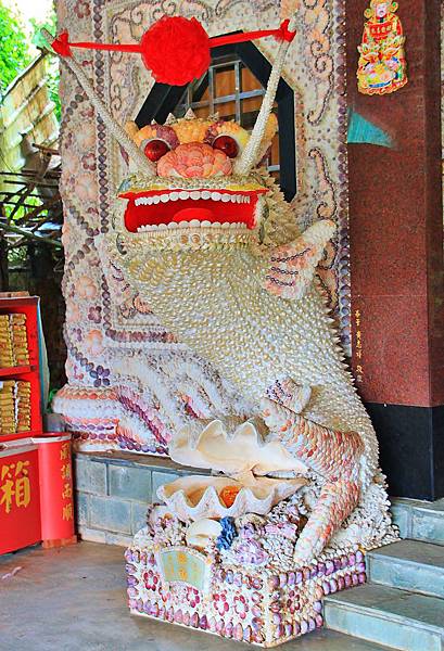 貝殼廟有別於一般廟宇的守護石獅子,這裡的守護神是用許多貝殼及珊瑚所雕塑的【鰲魚】,造型為龍首鯉魚身,相傳有祈雨鎮壓火災的函義。