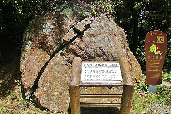 途中經過一顆大岩石,名為晴天霹 三陽開泰。這顆大石頭是在1999年921大地震,山河變色、天崩地裂後留給大地的傷痕。雖然巨石依然屹立山頭,但經強震後龜裂為三,仍攜手相連,是大地意濃情深!
