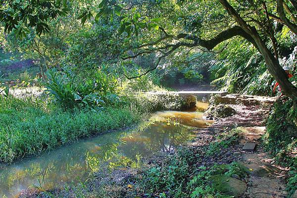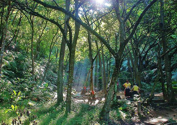 步道間都有簡易的石製桌椅供人休息。一早就有不少婆婆媽媽前來運動!