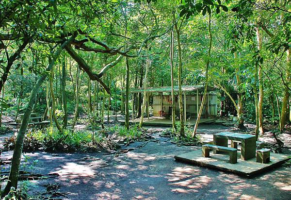 步道間有個小廣場與遮雨棚,一旁還有土地公廟。