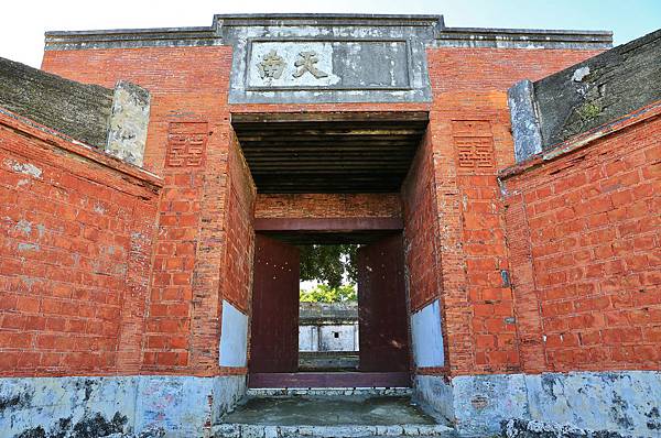 「旗後砲臺」之正門為中國式建築風格之八字牆,而門牆兩邊用磚砌的「囍」字,為其特色。門額於乙未之役(1895)遭日艦砲擊毀損,門額之「□□天南」四字,僅能從老照片中辨識「天南」二字,因此高雄市政府於民國80年(1991)進行修復時,「天南」二字參考老照片摹寫放大施作,「威震」二字以虛字呈現。