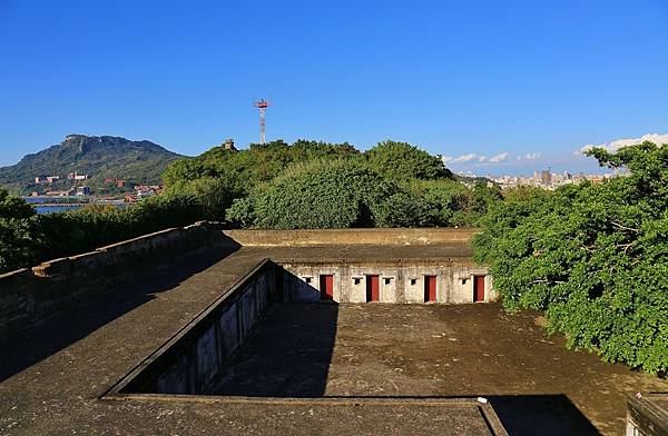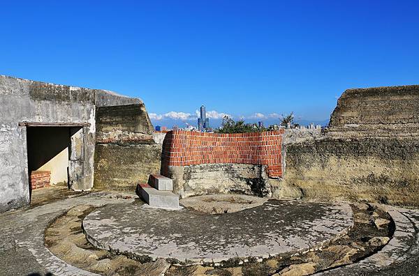 清末為扼守打狗港整體安全,於打狗山的大坪頂、哨船頭及旗後山上,依地形高度設置有三座砲臺,其中最高處的「大坪頂砲台」,現已埋入土堆,次高為「旗後砲臺」,最低為哨船頭之「雄鎮北門」砲臺,三個砲臺互成犄角,結合成為一組防禦線。攝於旗後砲台,可遠眺高雄85大樓。