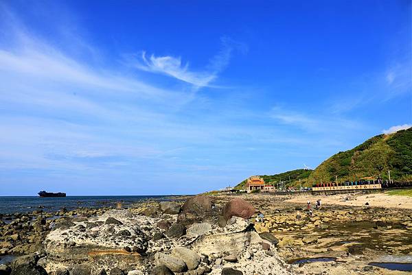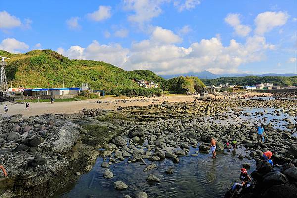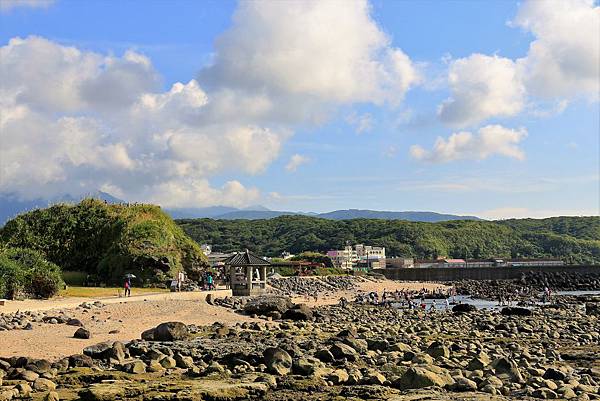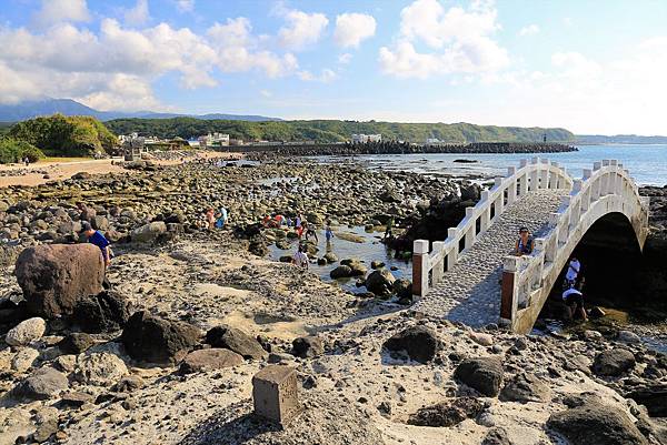 海岸邊有不少遊客在此戲水。岸邊的涼亭與拱橋也是石門洞的特色之一。