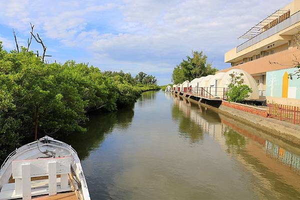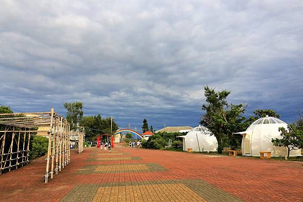 園區很大,但實際上人可以行走的空間大概就只有入口出的大廣場、四周的紅樹林木棧道還有沙灘邊了!園區有提供住宿區給遊客使用,這裡看到的蒙古包是帳篷區。也就是一個蒙古包的空殼,裡頭什麼都沒有,可以自備帳篷來此露營!