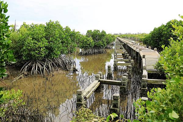 木棧道成U字型在紅樹林內繞了一圈,結果最後通往中央廣場的木棧道被颱風吹壞了!又適逢滿潮,水都淹了上來。這一帶又有台南版的小忘憂森林之稱!