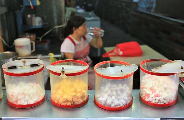 老闆娘相當有趣,有問必答。一直很好奇為何他們都要備這4桶生的料在攤位上,不先煮好。老闆娘說,這樣才能給客人吃到最好的品質!因為剛煮好的這些配料,口感最Q彈,味道也最不會跑掉,如果放久甚至放隔夜,口感會變得很奇怪,味道也不對了!