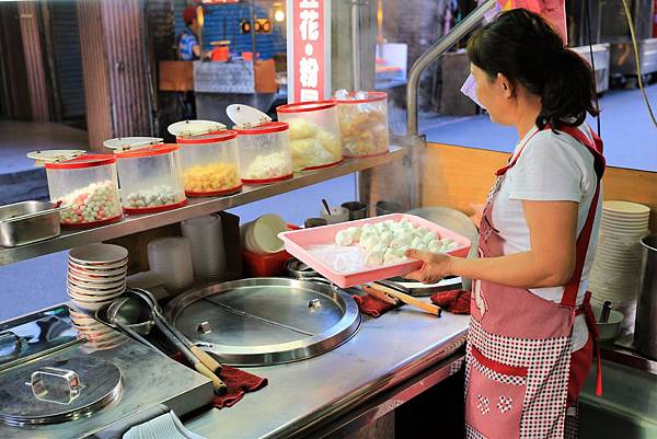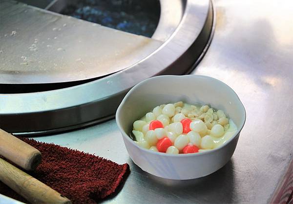 撲通撲通,鹹湯圓下鍋囉!攤子上面坐右邊那兩罐是酥餅和油條。聽老闆娘說,這一帶的人,很喜歡把酥餅和油條加在花生湯或紅豆湯內一起享用,非常特別的吃法!花生湯和紅豆湯也是窄巷圓仔店的招牌,順口又香甜,大推!