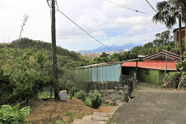 之後會從石階步道接到柏油路上。此處還可以看到遠方的五指山、七星山和大屯山群。