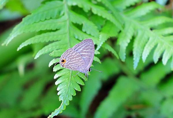 白波紋小灰蝶,Jamides alecto dromicus,屬小灰蝶科,展翅33 - 37 mm,雄蟲翅膀表面青白色具藍色光澤,外緣黑色,雌蟲前翅外緣黑色區域較寬大,翅面顏色較深,翅腹面淡褐色具白色條狀斑紋,雌蝶翅型較大,斑紋較白。本屬4種,本種為台灣波紋小灰蝶中體型最大的,普遍分布於平地至低海拔山區,幼蟲食以野薑花、月桃等寄主。