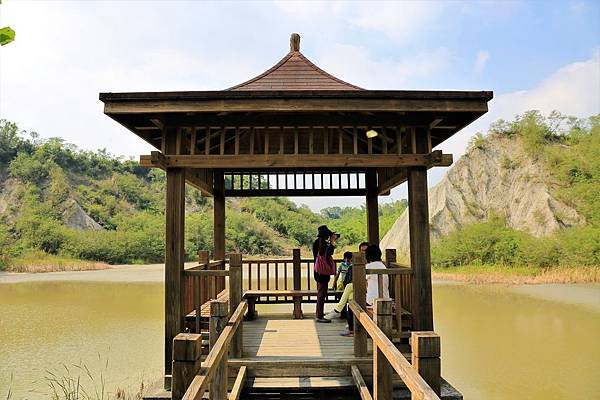 步道終點就是這這座涼亭!涼亭建於另一座湖的上方,湖水也乾了一大半,四周則是月世界小山丘環繞還有龜裂的湖底。