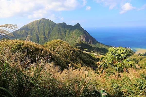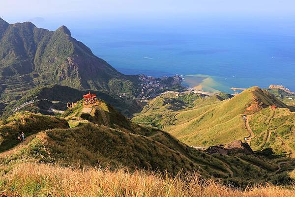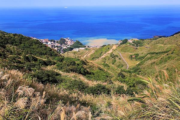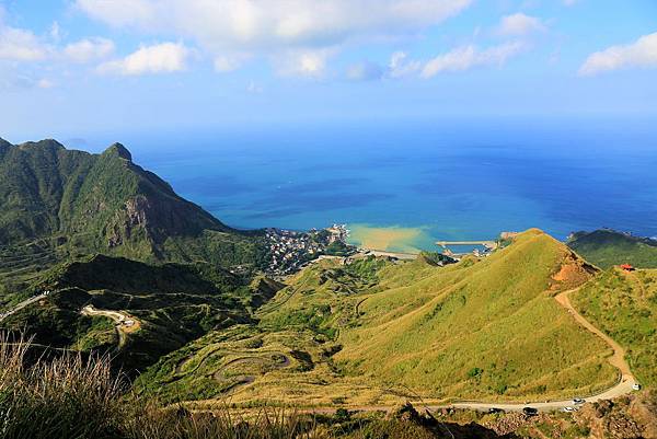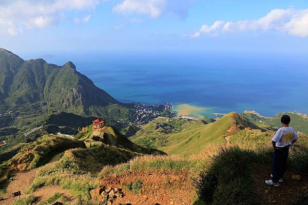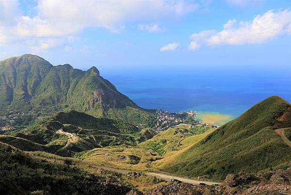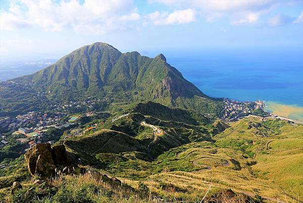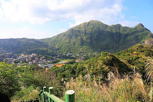 稍稍爬上來一些,就可以看到金瓜石社區,還有時雨中學的操場。可以發現金瓜石社區剛好由基隆山、報時山和茶壺山所環繞。