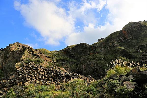 山頂的茶壺離我們越來越近拉。這些大顆的碎石是角礫的岩化作用,高溫的熱水在此地區也形成許多的角礫岩構造以及角礫岩礦筒。它是由高溫高壓熱水在地底下將岩石爆破,形成岩石具有破碎的構造。這種角礫岩的破碎構造在沉積岩內較常見到。