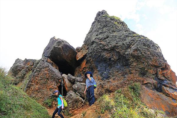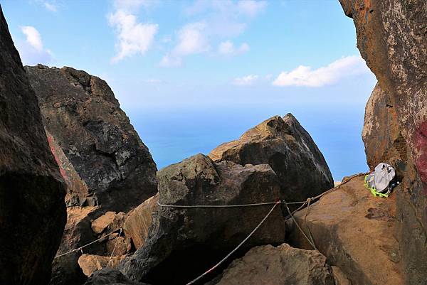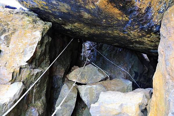 其實山頂的茶壺是可以貫穿過去,爬到頂端,再繼續往前到半屏山。有沒有注意到照片中間偏左有個很狹窄附繩子的洞?沒錯,就是從這裡進出...
