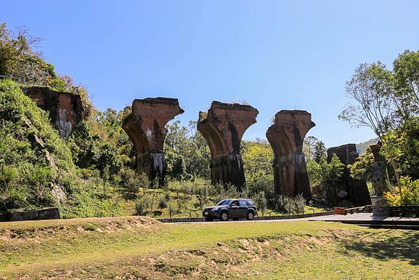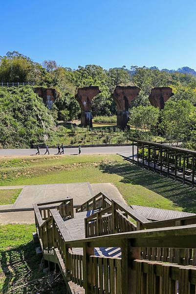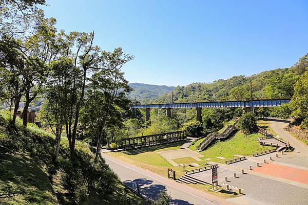 龍騰斷橋入口處的大廣場,現在舊山線的鐵軌已經改到對面的鐵橋上。根據日據時期台灣總督府鐵道部所出版的台灣鐵道史記載,魚藤坪橋基礎工程,於1906年 (明治39年) 5月1日開工,1907年(明治40年) 1月30日完工。