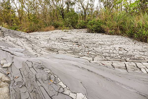這些都是未乾,但已經朔形龜裂的泥漿。雖然不會燙,但畢竟是石油氣混合在泥漿中,大家還是不要去踩踏或觸摸。