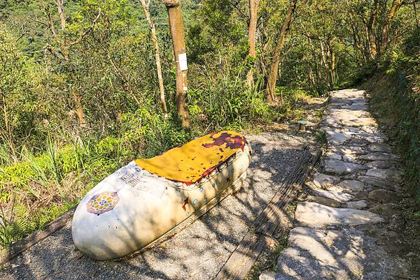 沿途的裝置藝術品,南朝的謝公屣造型座椅。根據"南史"記載,南朝山水派筆祖-謝靈運,性喜登山健行,因而改造木屣,以利登山時保持人體平衡。此古代登山鞋又名為"謝公屣"。